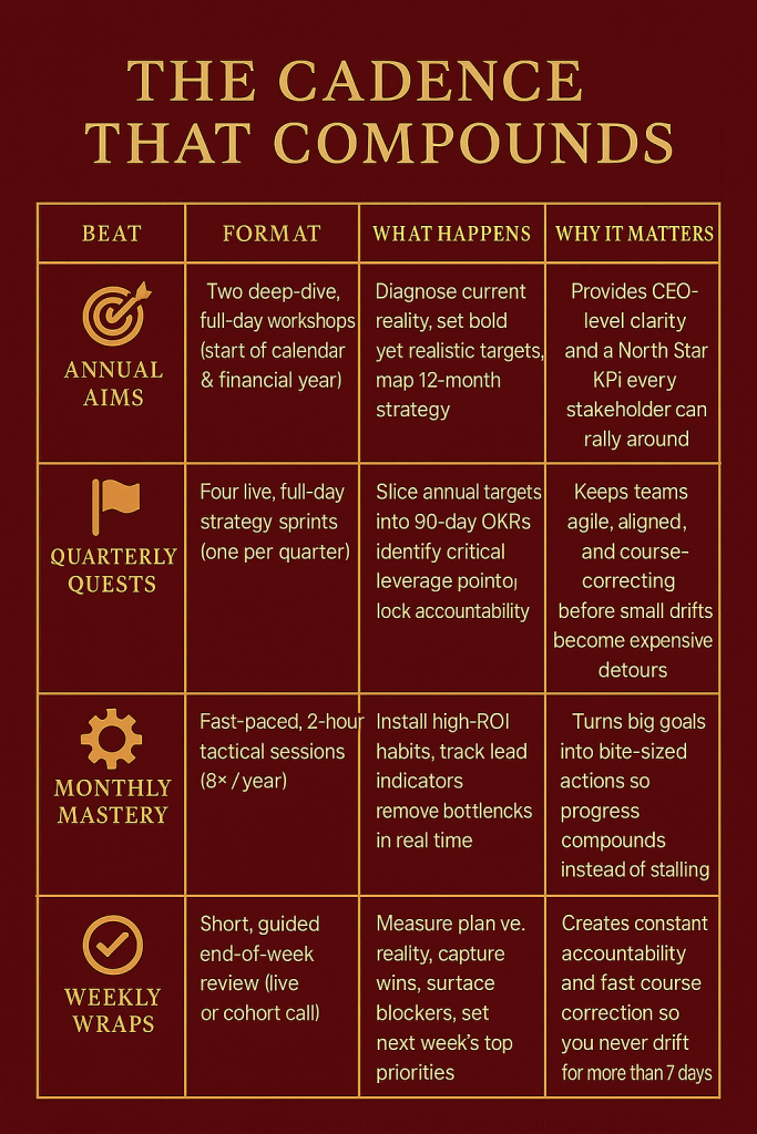 • Monthly Masteries Sessions (2–3 hrs): Lock in one high-leverage habit or capability each month.