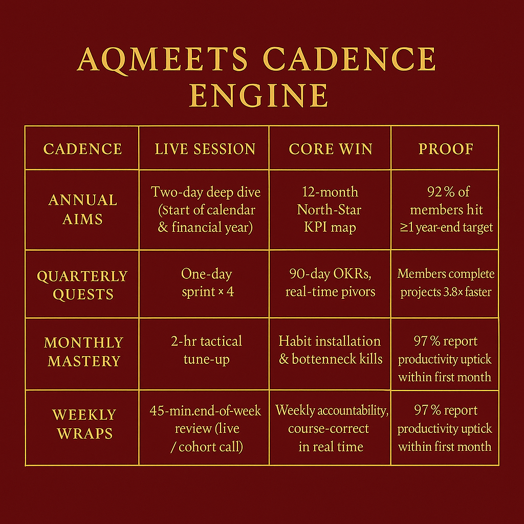 Instead of the usual “one-and-done” seminar high, AQMeets gives you a built-in execution rhythm – month by month, quarter by quarter, year by year – so momentum doesn’t stall.